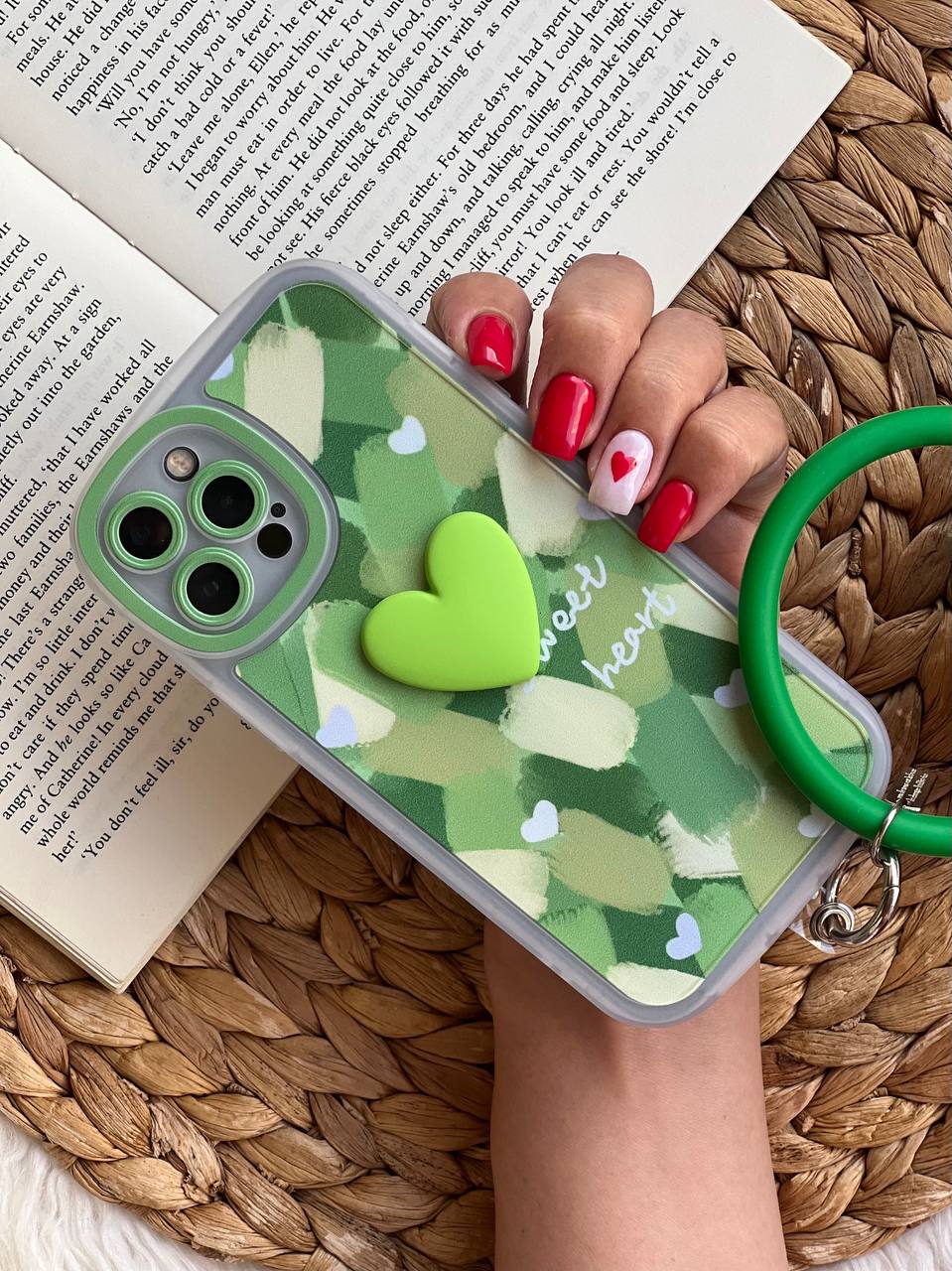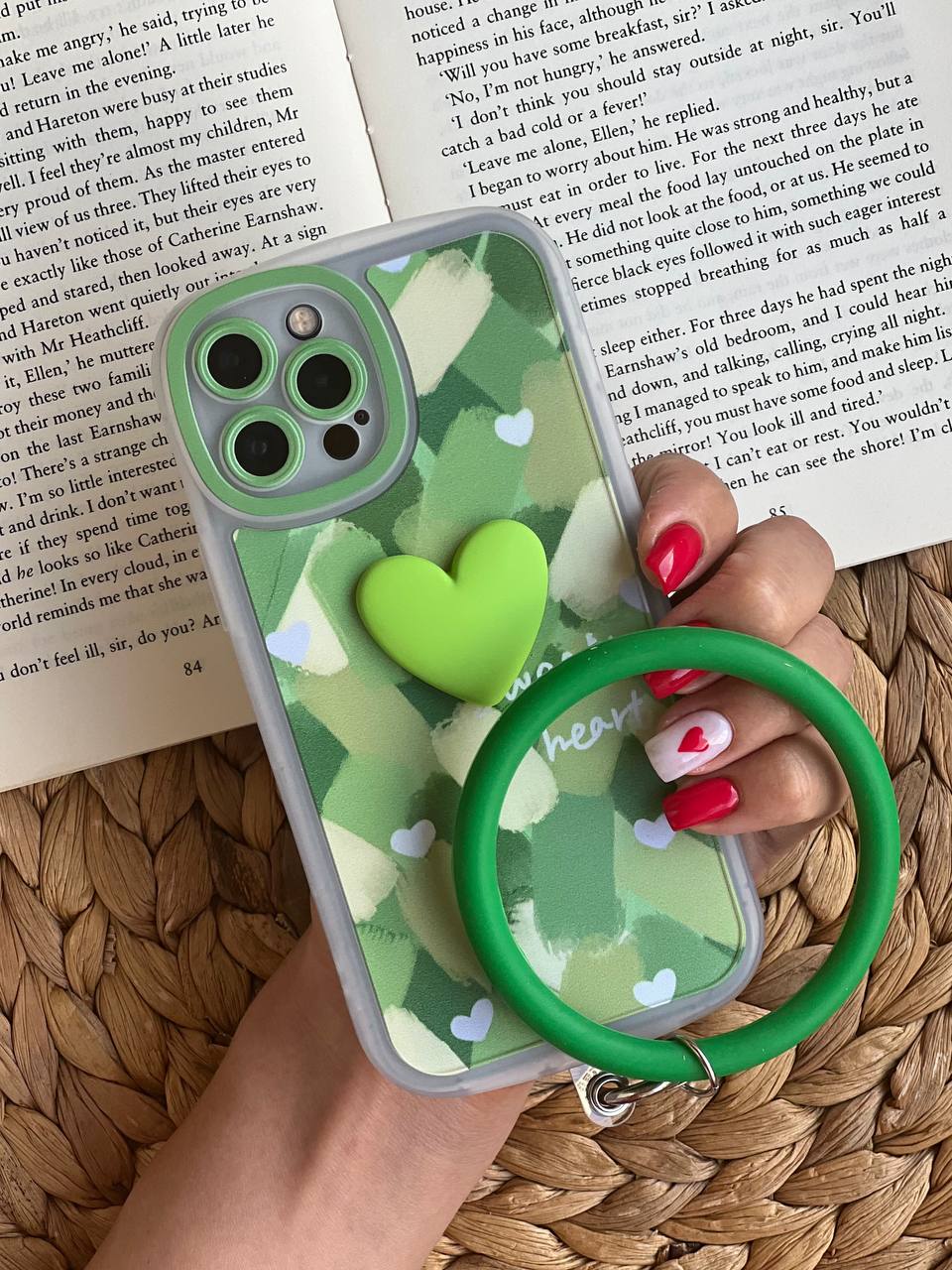 قاب موبایل آیفون تک دل حصیری سبز حلقه دار محافظ لنزدار