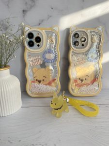 قاب موبایل آیفون خرس پو زرد آکواریومی مروارید دار گوش دار