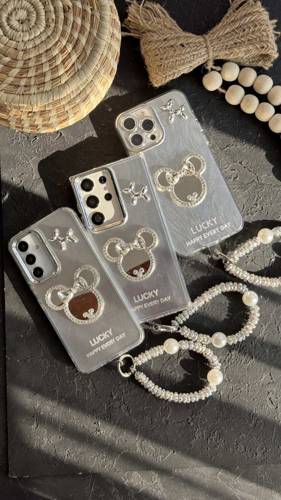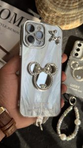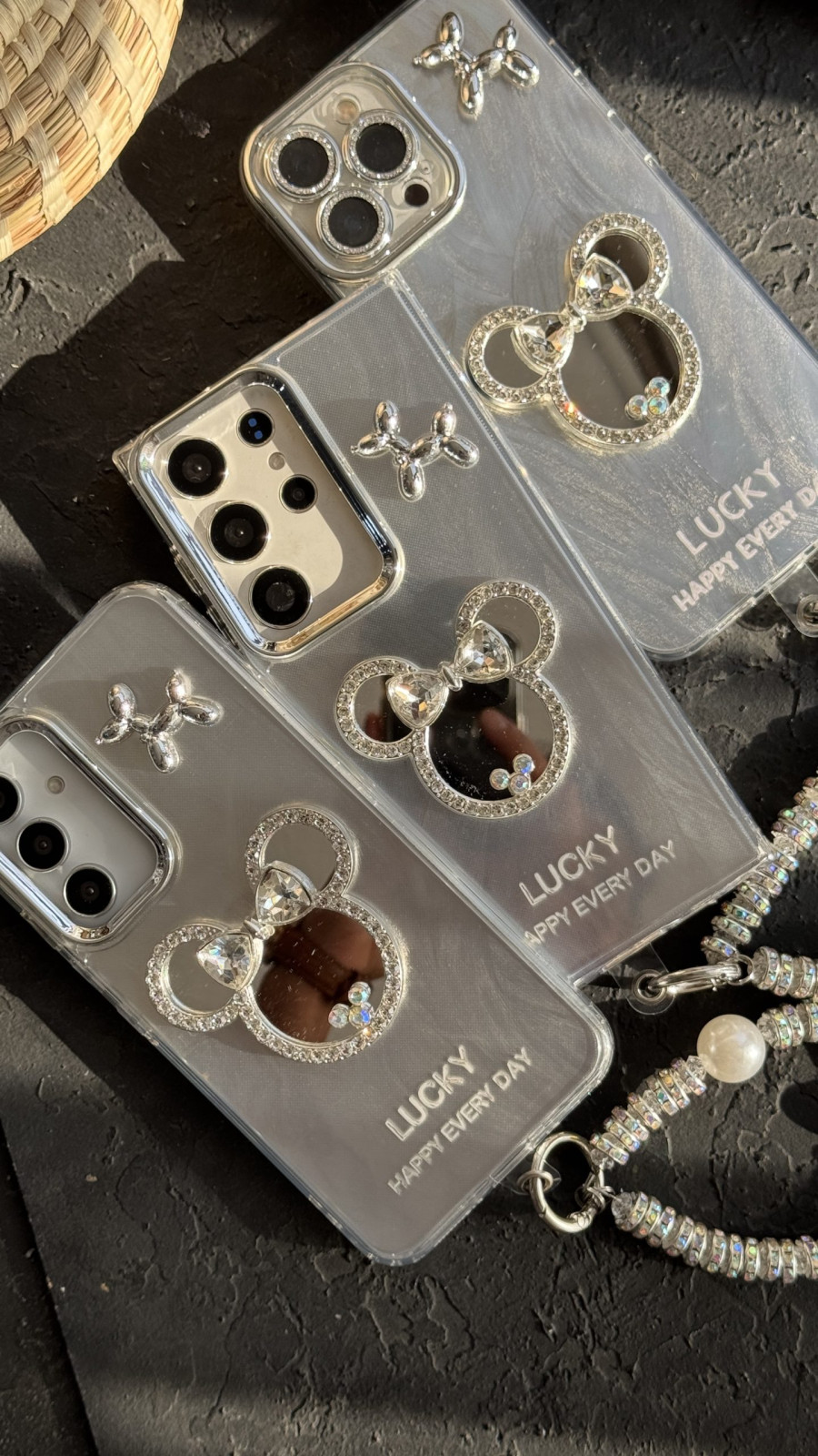 قاب موبایل ( آیفون – سامسونگ ) میکی اسکوییکی داگ آیینه ای نگین دار + بندست