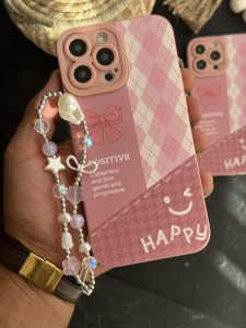 قاب موبایل آیفون پاپیون لبخند چهارخونه صورتی بندست ( بدون بند )