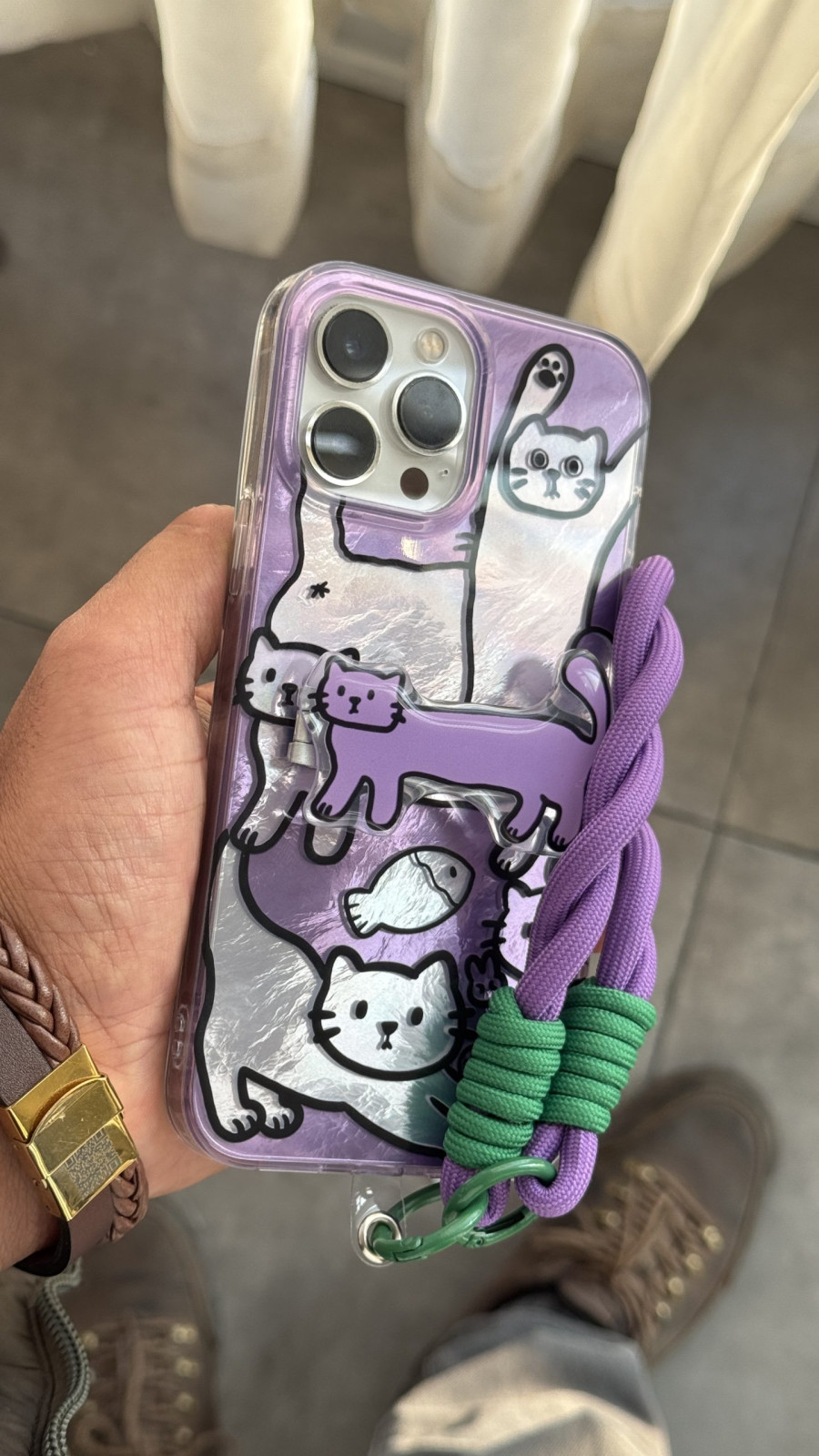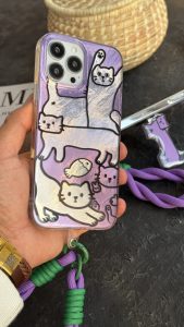 قاب موبایل آیفون گربه دراز سوسیسی بنفش پایه استندشو + بندست