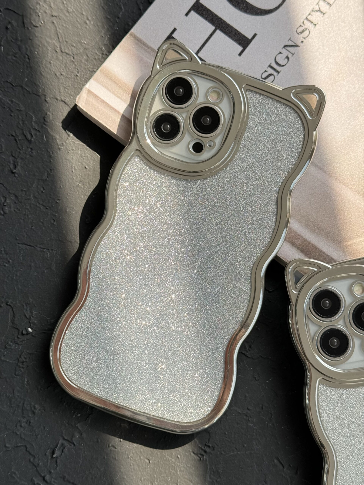 قاب موبایل آیفون گربه شاینی نقره ای گوش برجسته