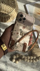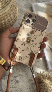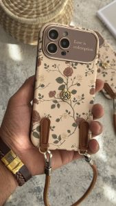 قاب موبایل آیفون گل فلاور کرم فندقی + بند چرمی ست