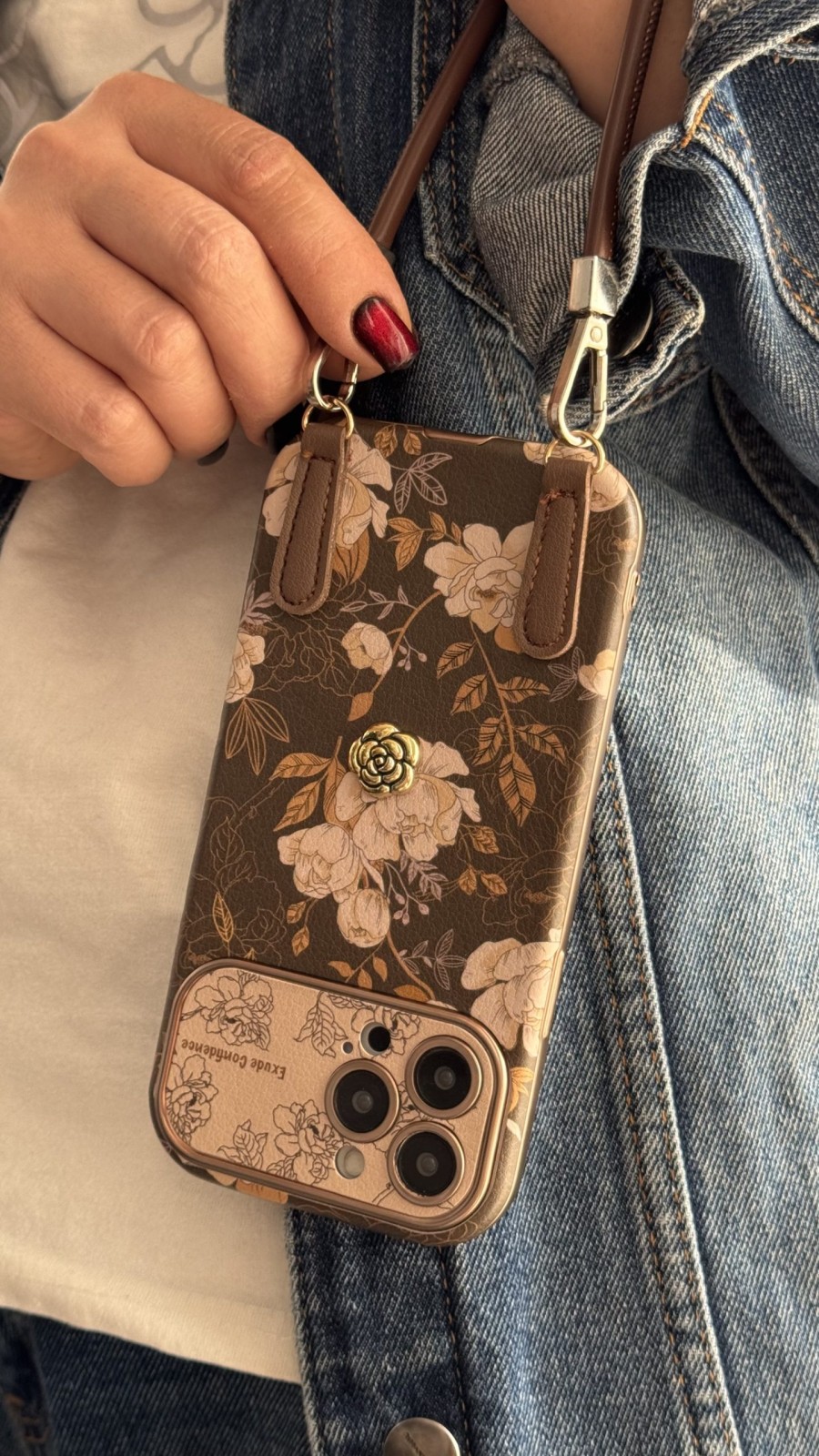 قاب موبایل ( آیفون ) گل رز فلورا قهوه ای + بندست چرمی