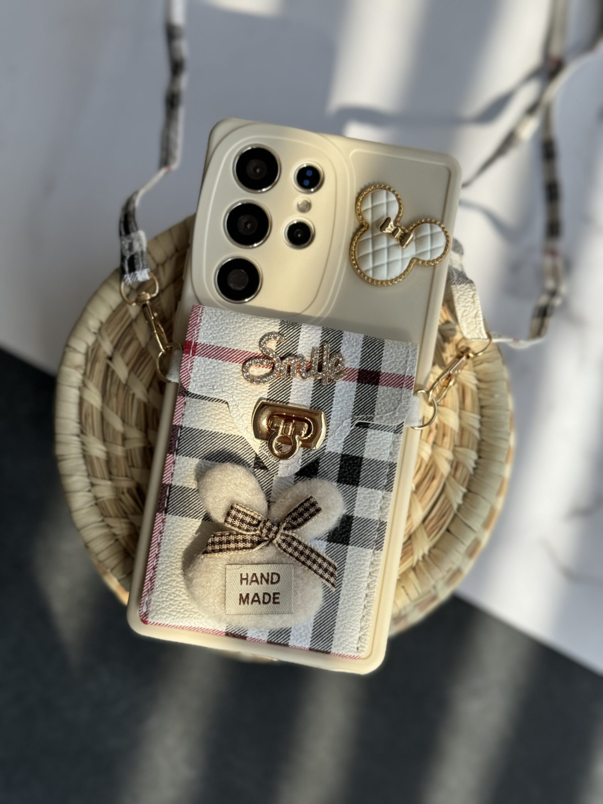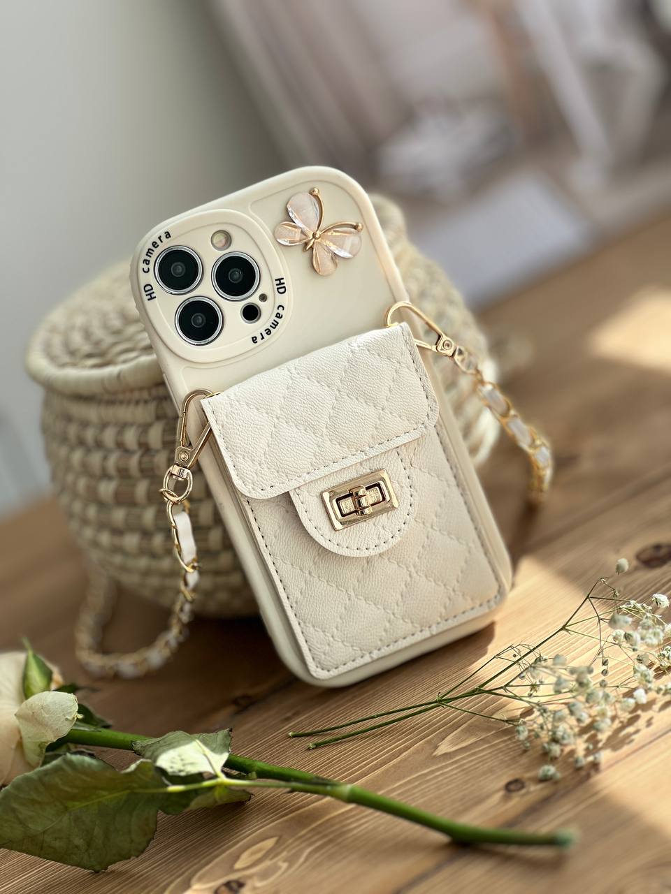 قاب موبایل ( آیفون – سامسونگ ) بند زنجیری بلند بالشتی پروانه ای جاکارتی دار