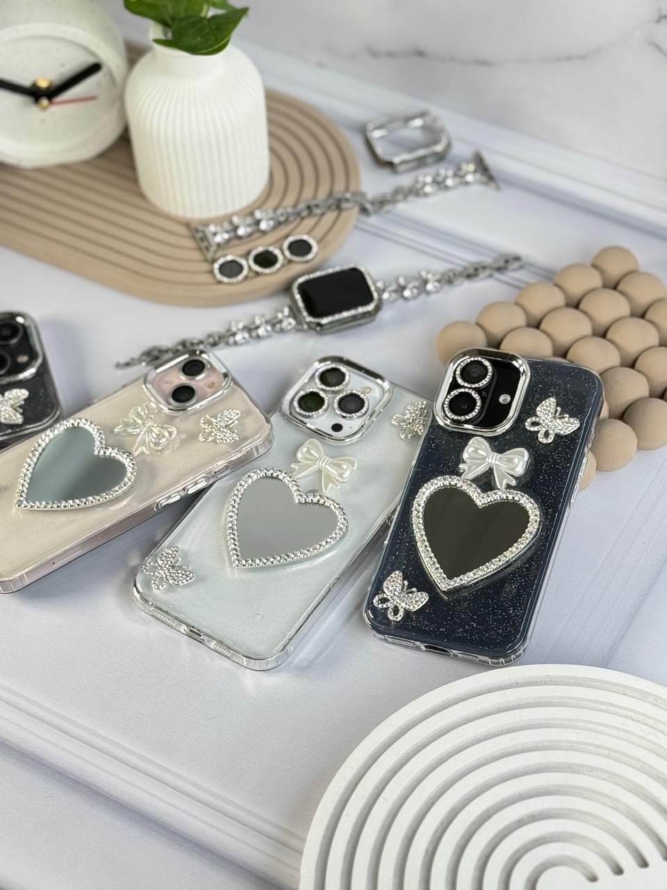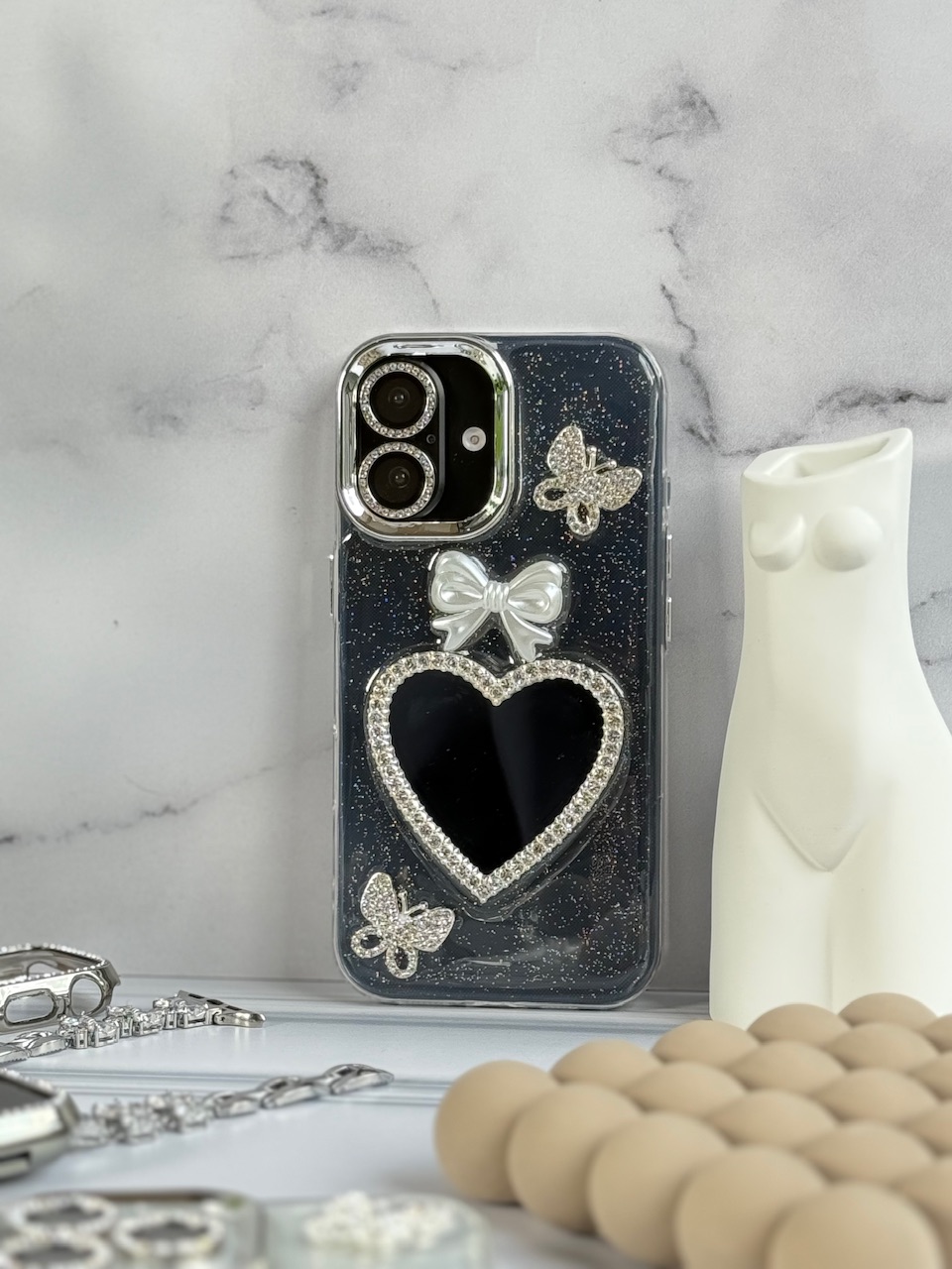 قاب شاینی قلب آینه ای با محافظ لنز رینگی نگینی (کدC1889)
